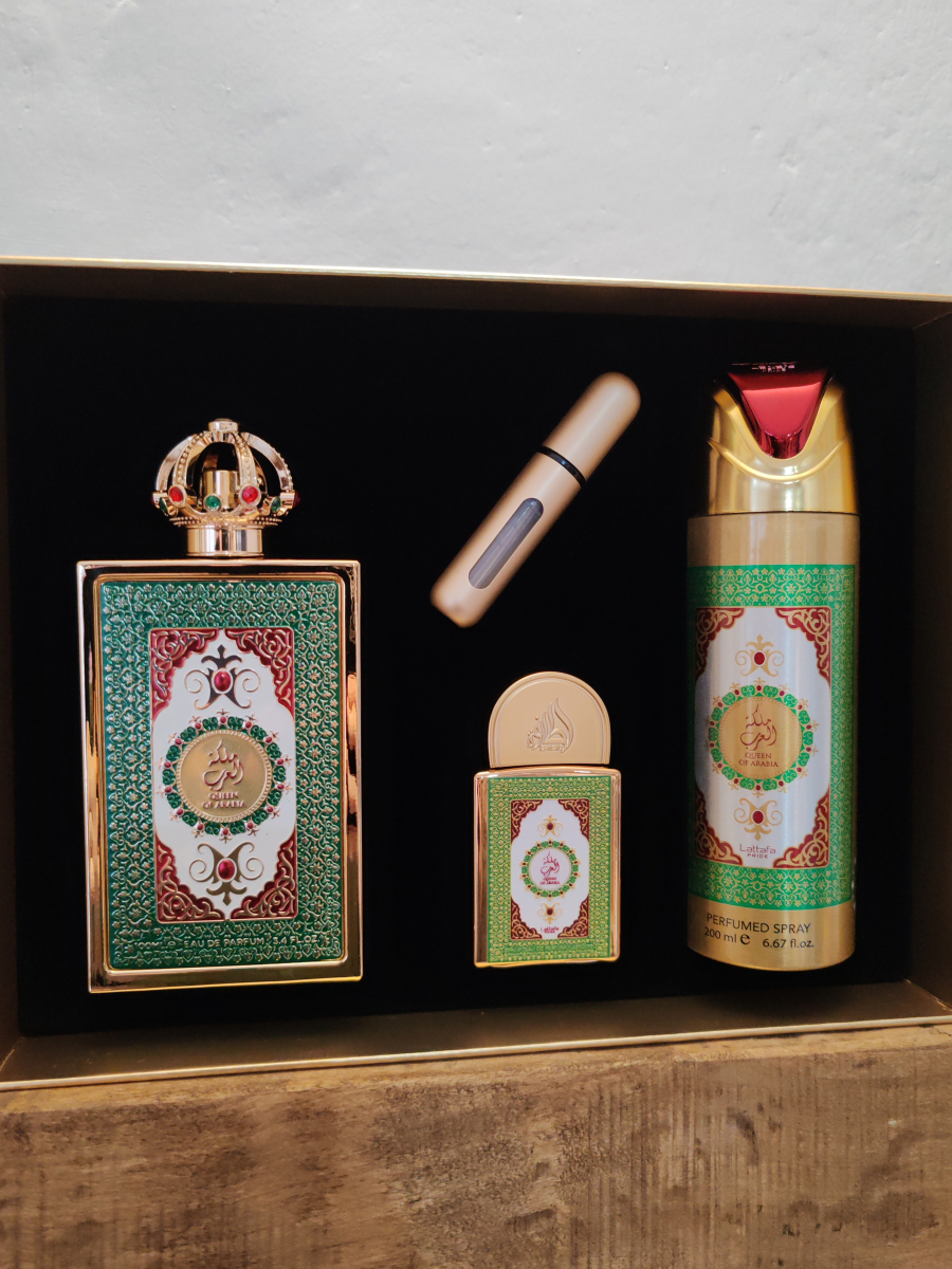 Lattafa Queen of Arabia darčeková sada edp 100ml + edp 20ml + Perfumed Spray 200ml + parfémový naplniteľný flakón 5ml